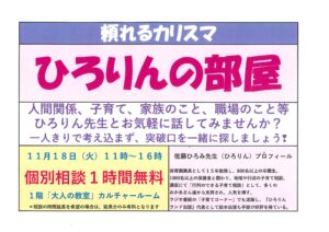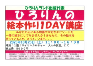 ひろりんランド出版代表 ひろりんの絵本作り1DAY講座 あなたの心にある物語や大切なエピソードを一冊の絵本にしてみませんか? あなたのその絵本を持っている人がきっと、います。。。 2025年10月25日(土)11:00~16:00 場所:1階「ロイヤルカルチャー 大人の教室」にて 参加費:5000円 子育てママの頼れるカリスマ ひろりんの部屋 2025年11月18日(火)13:00~16:00 人間関係、子育て、華族のこと、職場のこと等 ひろりん先生とお気軽に話してみませんか? 一人きりで考え込まず、突破口を一緒に探しましょう❣ ★個別相談1時間無料 頼れるカリスマ ひろりんの「人生お助けセミナー」 「幸せ案内人」ひろりんが、「幸せに生きるヒント」をお届けします 12月20日(土)13:00~14:30 場所:2階「レンタルスペース」入場無料 佐藤ひろみ先生(ひろりん)プロフィール 保育園園長として15年勤務し、800名以上の卒園生、 1000名以上の保護者と関わり、地域や行政の子育て相談、 講座にて「行列のできる子育て相談」として、多くの おかあさん達から支持され、人気を博す。 ラジオのパーソナリティとしても活躍し、「ひろりんランド出版」 代表として絵本出版も手掛け好評を得ている。